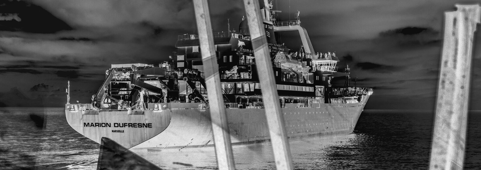 Ce travail photographique se compose d’images en couleur et en noir et blanc, aux traitements particuliers. Inspirées par l’utilisation des microscopes électroniques, ces photos passent du positif au négatif, donnant l’impression radiographier le navire et son équipage. Elles juxtaposent l’espace immense de l’Austral et l’infiniment petit des échantillons collectés par les scientifiques. Elles transforment les portraits grâce à l’application de produits chimiques utilisés par les scientifiques lors de leurs protocoles de recherche. Il s’agit d’un essai artistique complet entremêlant une multitude d’environnements, d’ambiance et de personnalités.